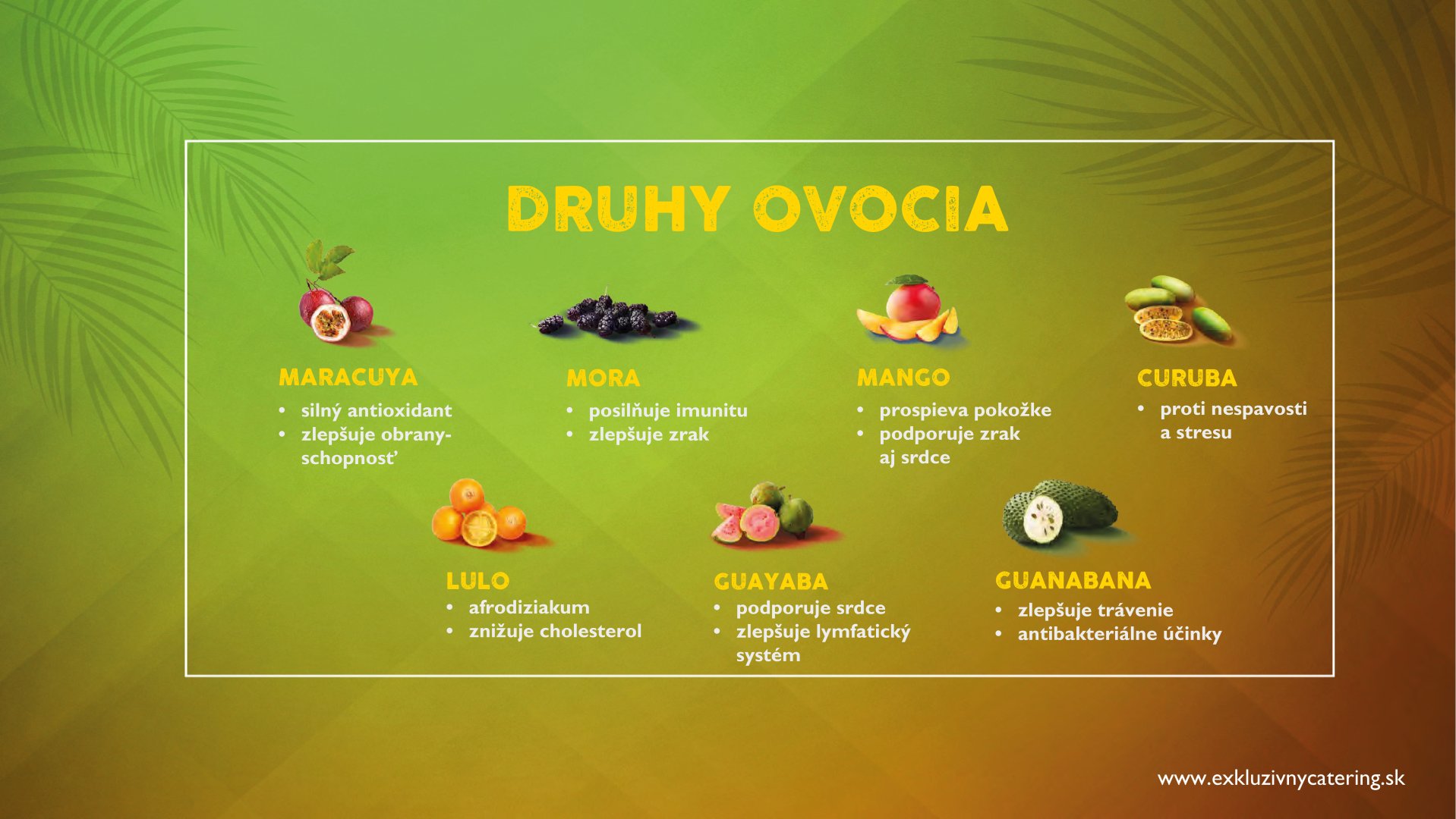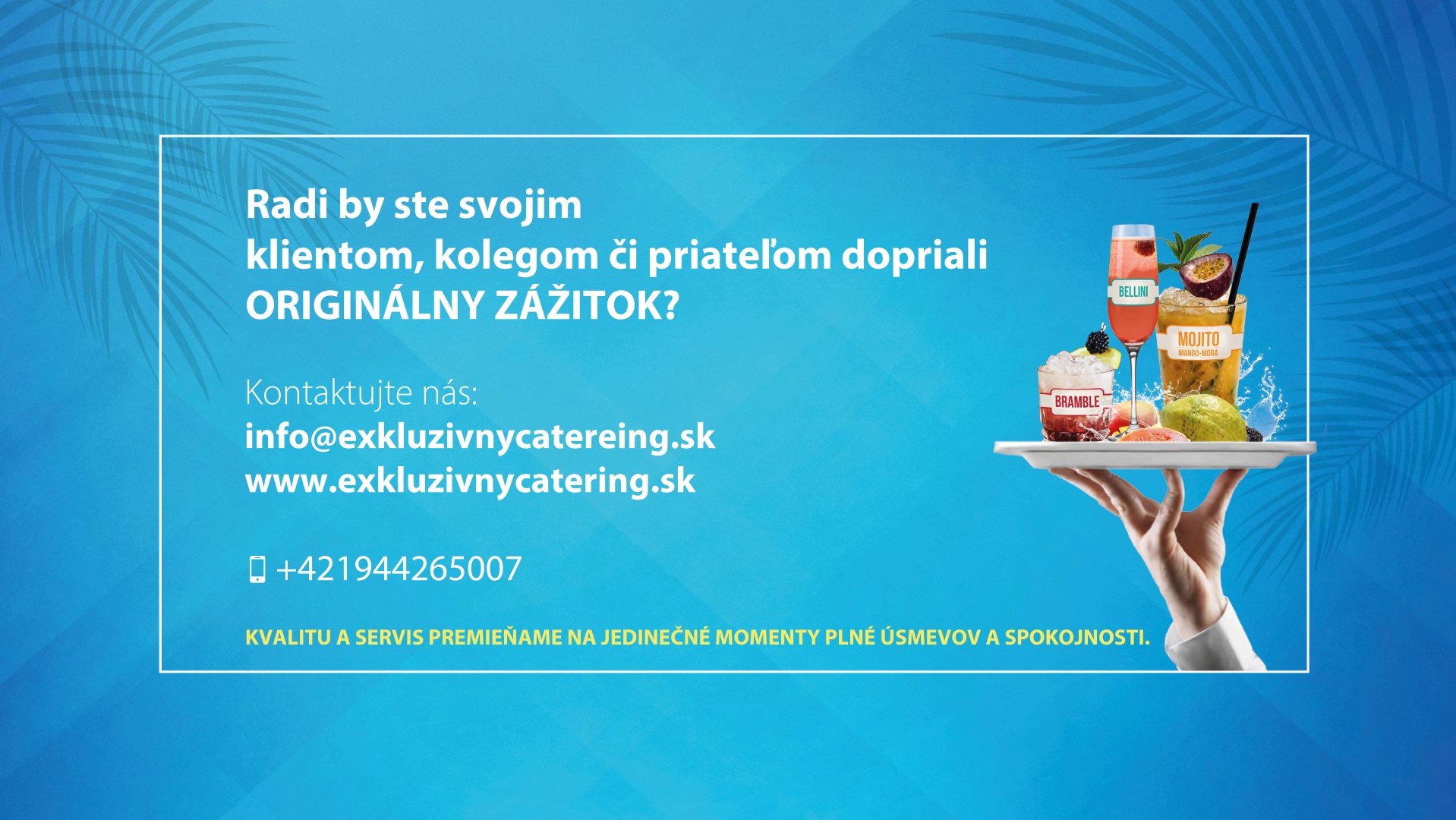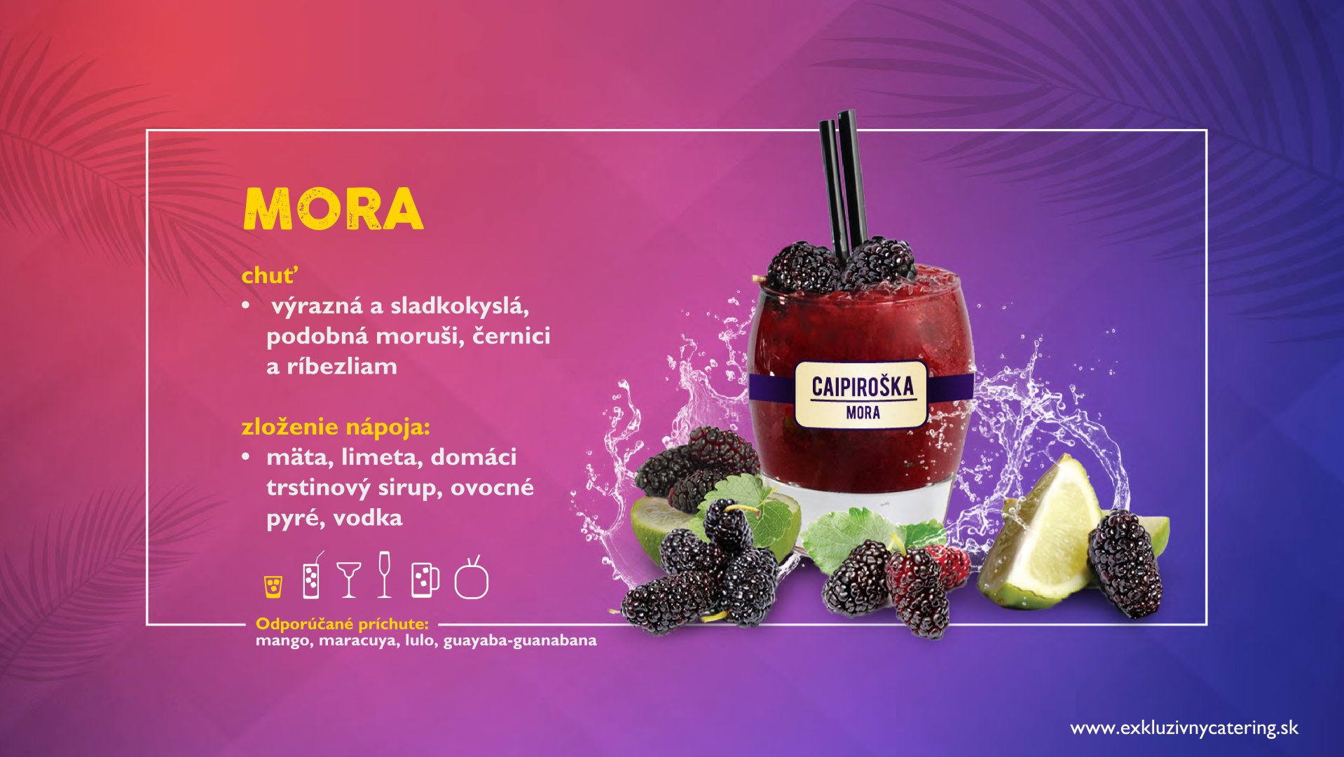 Naše alko/nealko kokteily, džúsy a limonády pripravujeme z najkvalitnejších ingrediencií zo 100% prírodných dužín tropického ovocia, ako aj čerstvého ovocia a prémiových destilátov. Väčšinu surovín kt.používame si pripravujeme v našej “kuchyni” (ovocné pyré, sirupy, ktoré si varíme, peny, atď.) Vyhýbame sa E-čkovým tovarom. Všade kam prídeme, osviežime atmosféru, roztancujeme, namiešame pozitívnu náladu a hlavne ulahodíme chuťovým zážitkom. Náš bar dokonale zapadne do príbehu Vášho večera a obohatí Vám zábavu s nezabudnuteľnou atmosférou.