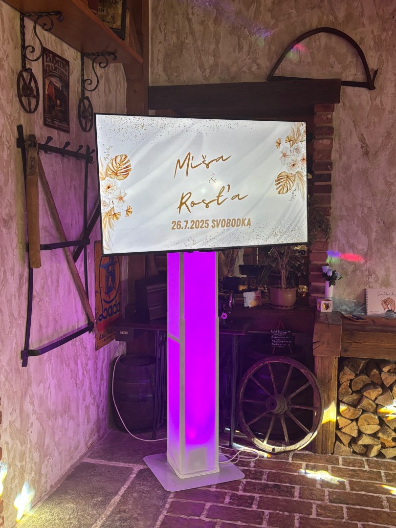 Na přání nabízím svatební televizi – velkou LED obrazovku, na které mohou běžet vaše fotografie, videa nebo vzkazy od hostů. Pro milovníky zábavy nechybí ani karaoke set s profesionálními mikrofony a kvalitním ozvučením.
