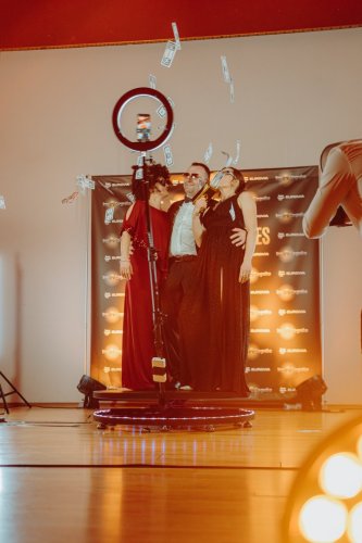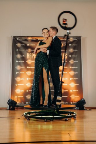 Hostia sa postavia na plošinu a kamera ich nasníma v 360° pohybe – výsledkom je krátke, efektné video pripravené na okamžité zdieľanie na sociálnych sieťach.