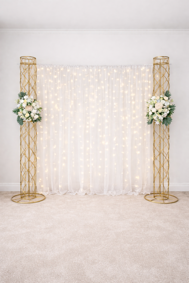 Dekorácie prenajímame buď bez výzdoby ako čistý minimalistický základ pripravený na vlastnú kreativitu, alebo zabezpečíme kompletnú dekoráciu z kvalitných umelých kvetov, romantických svetielok či elegantných látok podľa farebnosti a štýlu vášho podujatia. Každý kus je navrhnutý s dôrazom na detail, variabilitu a jednoduchú kombinovateľnosť, aby sa prirodzene prispôsobil moderným, romantickým aj boho konceptom.