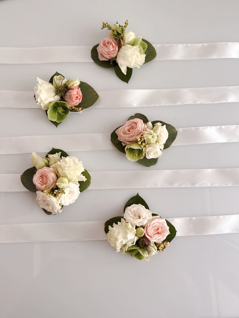 - Svadobná kytica, pierka pre ženícha, svadobných hostí, kvetinové náramky pre družičky