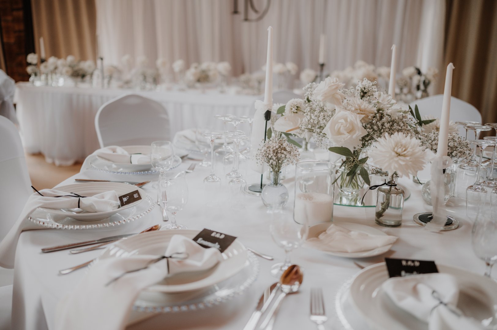 -Interiérová výzdoba hostinového priestoru vrátane stolových obrusov, štôl, podtanierov, zlatého príboru, niekoľkých druhov príručníkov, sviečok, svietnikov, váz, dekorácií, osvetlenia, šifónov a ďalších detailov.