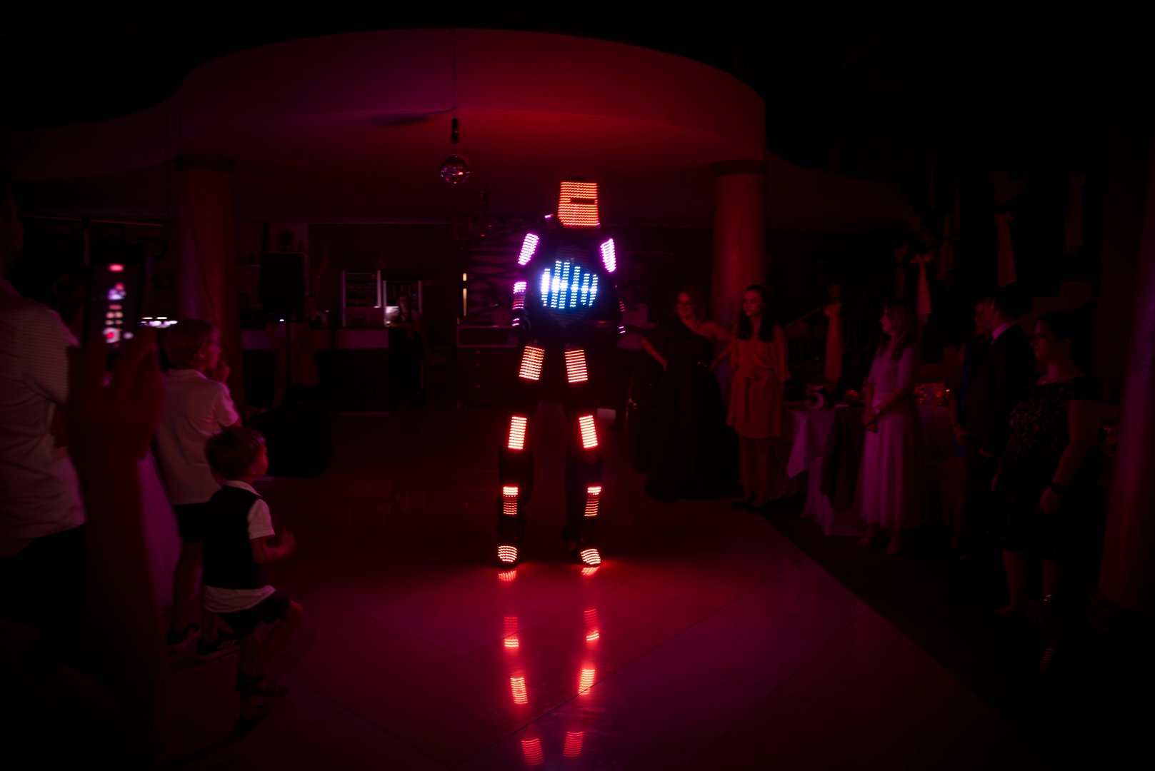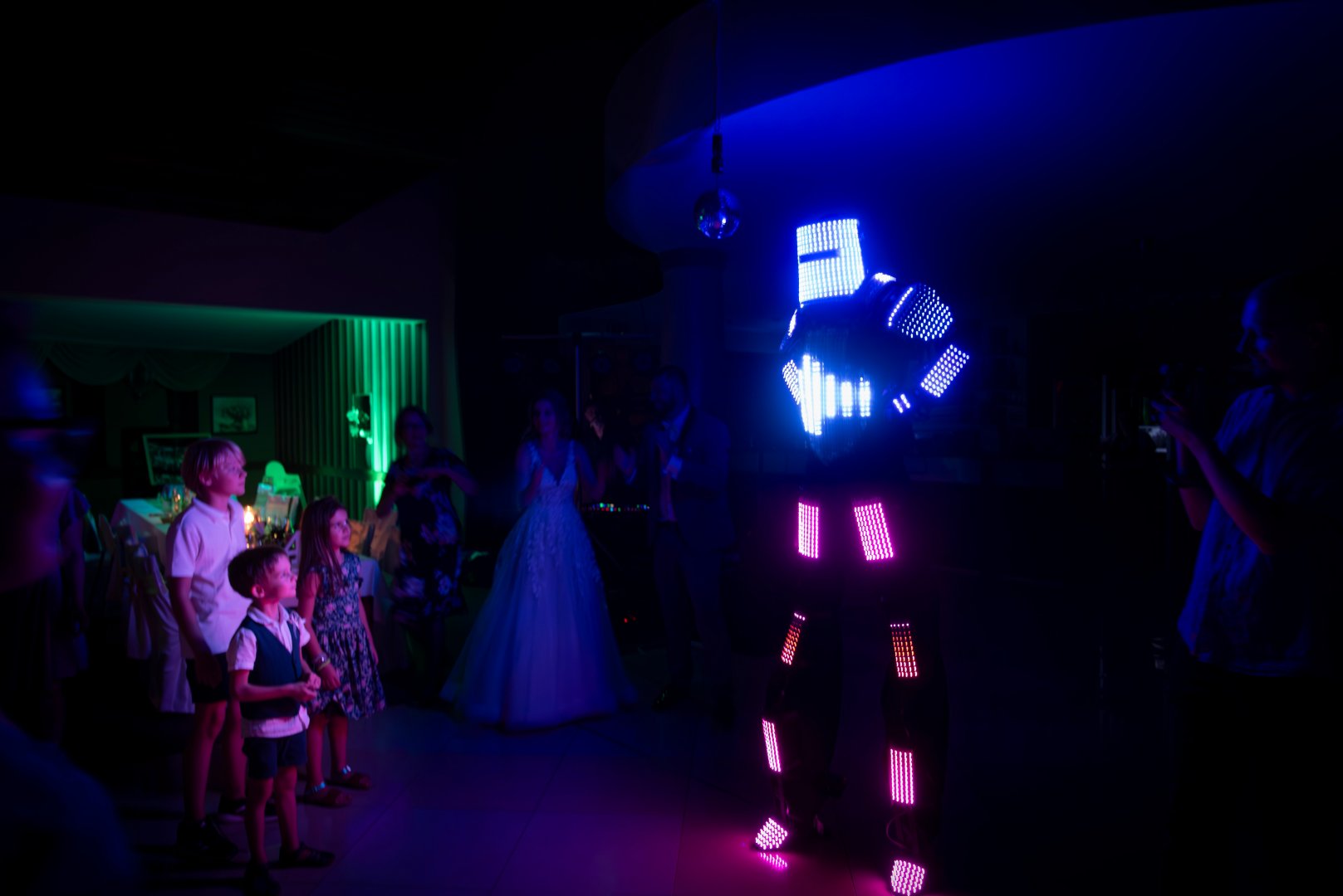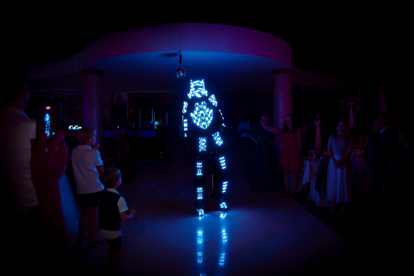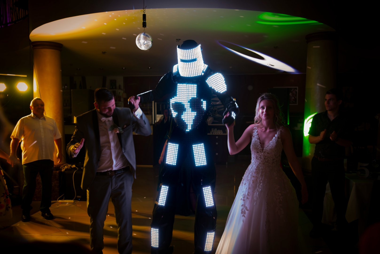 Predstavujeme vám Tron Pixel Robota – jedinečný prvok, ktorý dodá vašej svadbe wow efekt! Tento 2,5 metra vysoký svetelný robot je vybavený 1852 adresovateľnými RGB pixelmi, vďaka ktorým dokáže vytvárať magické svetelné efekty. Môžeme ho prispôsobiť vašej svadobnej téme – zobraziť vaše mená, dátum svadby, špeciálne nápisy alebo zvoliť farby, ktoré ladia s výzdobou.