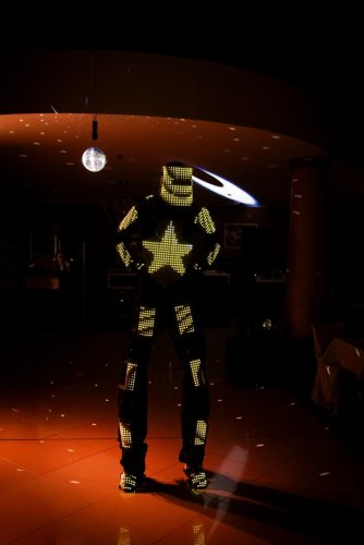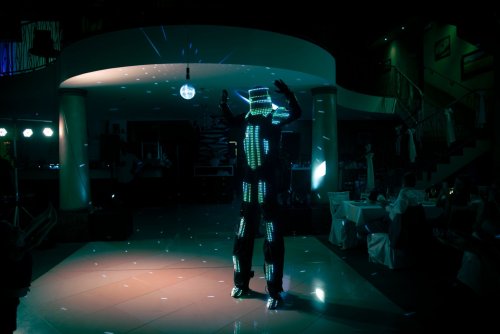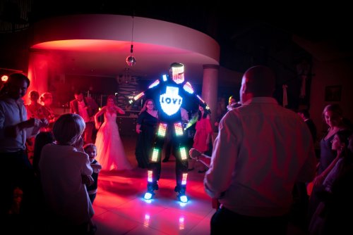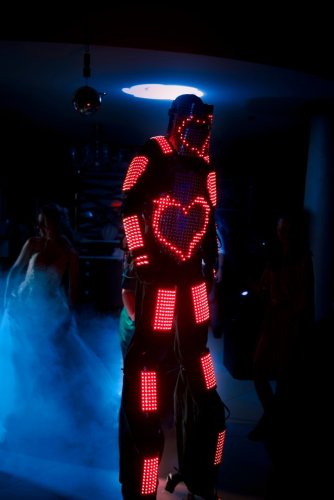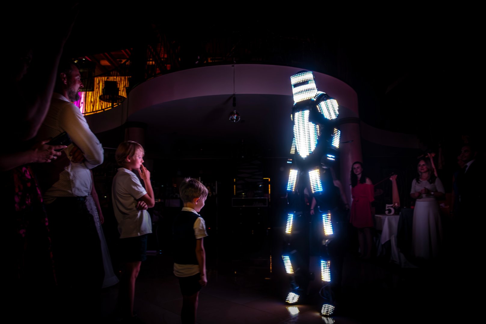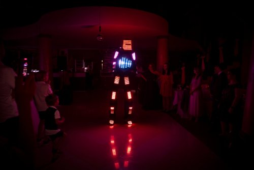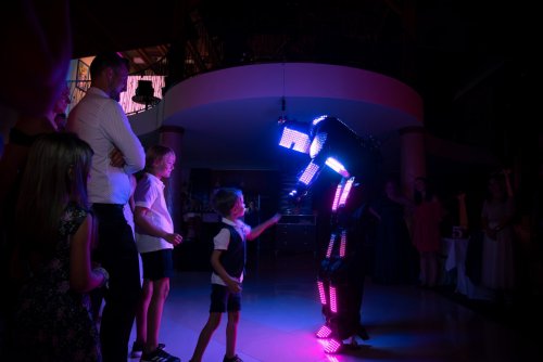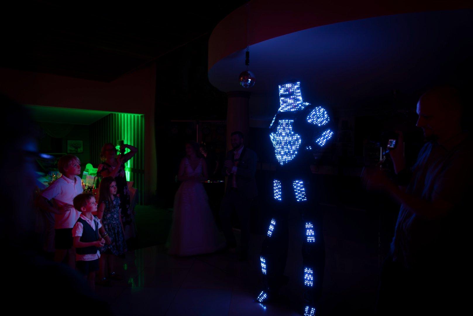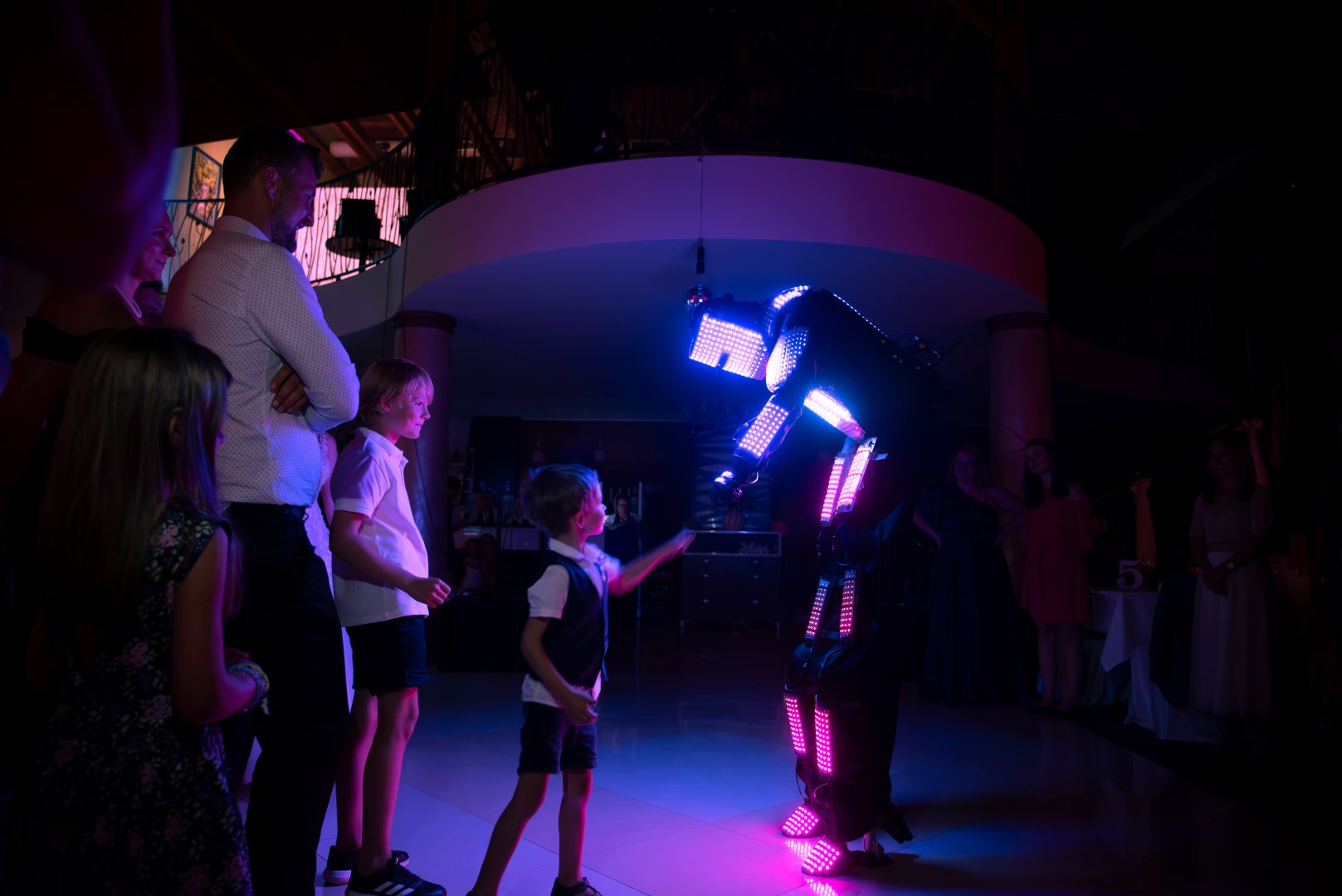 Predstavujeme vám Tron Pixel Robota – jedinečný prvok, ktorý dodá vašej svadbe wow efekt! Tento 2,5 metra vysoký svetelný robot je vybavený 1852 adresovateľnými RGB pixelmi, vďaka ktorým dokáže vytvárať magické svetelné efekty. Môžeme ho prispôsobiť vašej svadobnej téme – zobraziť vaše mená, dátum svadby, špeciálne nápisy alebo zvoliť farby, ktoré ladia s výzdobou.